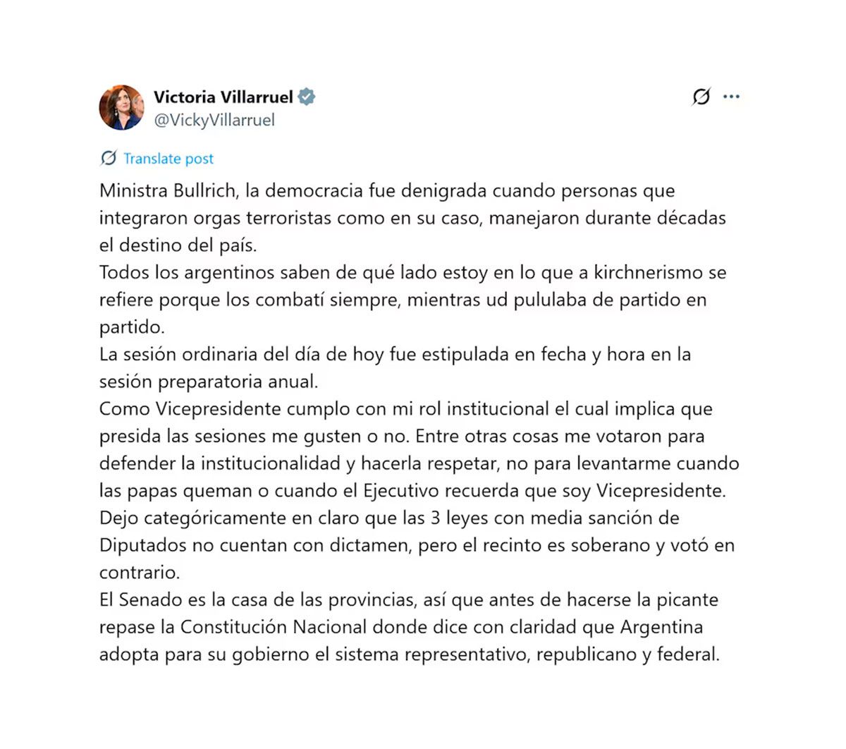 A través de sus redes sociales, Bullrich había expresado el malestar del Gobierno con Villarruel, al acusarla de ser “cómplice del kirchnerismo destructor” por permitir que avanzara una sesión impulsada por la oposición. “No sea funcional al pasado, al despilfarro y al quiebre del país”, escribió la funcionaria libertaria, marcando su distancia con el accionar del Senado.