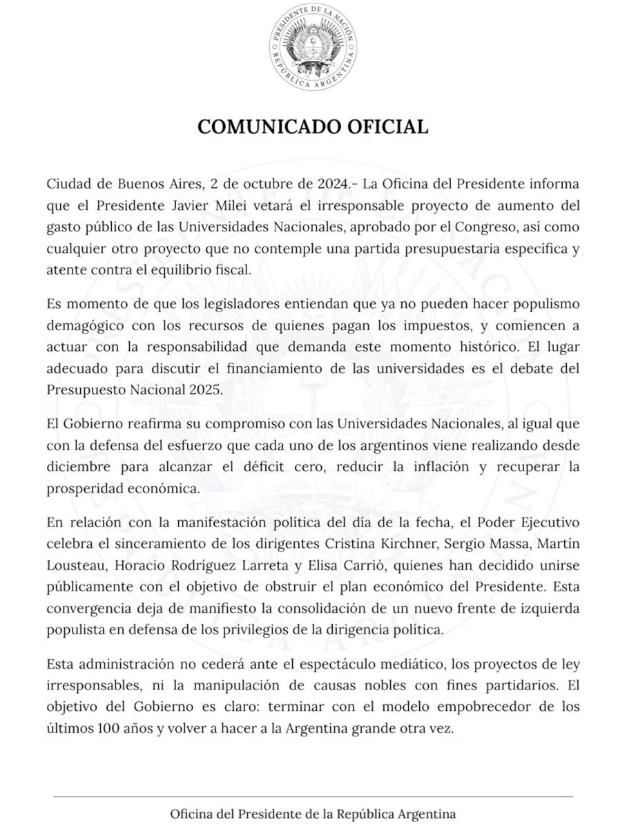 El Gobierno confirmó su veto a la Ley de Financiamiento Universitario tras la marcha federal universitaria, calificándola como “un irresponsable proyecto de aumento del gasto público”. Así lo comunicó la Oficina del Presidente en un comunicado oficial.