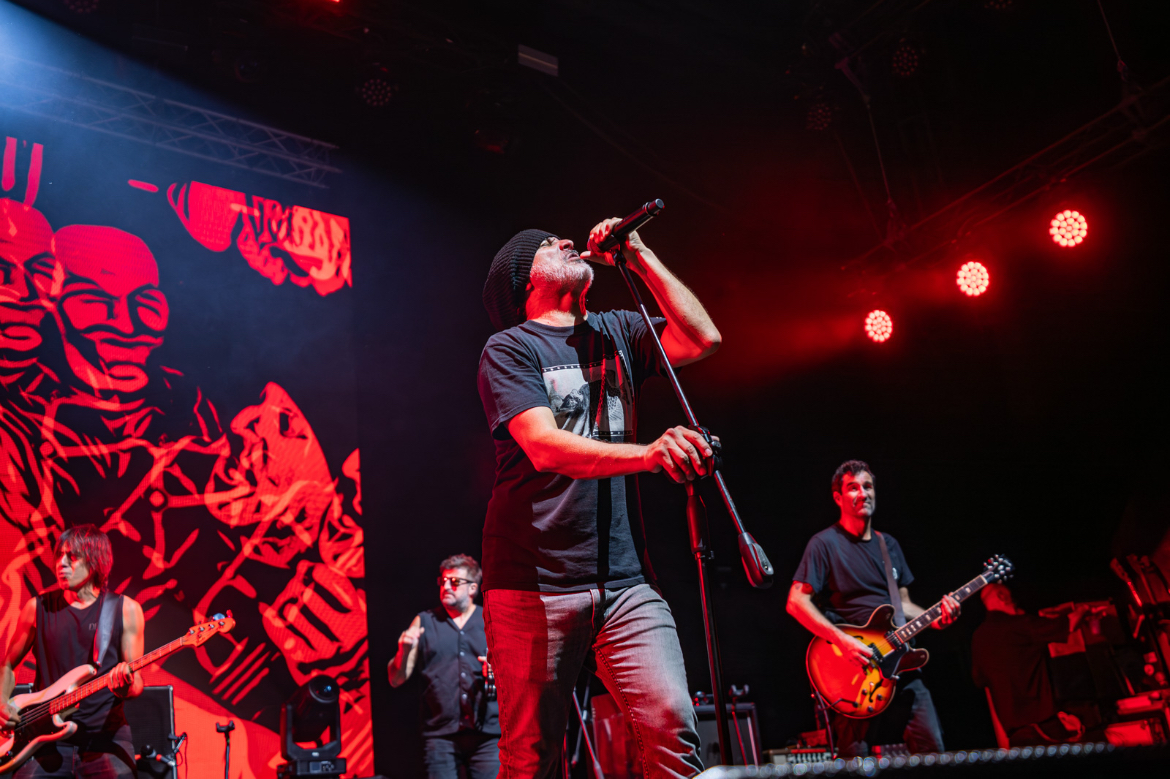 La atmósfera mutó en un tono más sombrío en “Clarobscuro”, que precedió a la recordada “Polidoro” y “Buenas mascotas”, ilustrada en pantallas por un cementerio de televisores. Sebastián ‘Cebolla’ Cebreiro lució el power de sus cuerdas vocales en temas como el anterior y “Los reyes de los buzones”. Las primeras gotas de lluvia se apropicuaron durante unos 45 minutos a partir de “Un frasco”, a la que irónicamente le siguió “Tormenta”, del álbum ‘Discopático’. “Va a escampar” fue una de las más cantadas en una noche en la que la lluvia potenció la emoción. En oposición se hizo presente el ska “La pastilla”, llevando consigo la máxima velera de “la palabra que diga poco pero con alma”. En un cielo de precipitaciones incesantes, las banderas continuaban flamenando mientras las gotas rodaban por brazos tatuados con frases de la banda, en un público que mantenía la energía al igual que los músicos. El clásico “Por dentro” inauguró uno de los momentos más distorsionados en un escenario teñido de rojo con “La sin razón”, seguida de “Para no verme más” que trajo un atisbo de calma para volver a repuntar con lados B como “¿Ves?” Y “No se”.