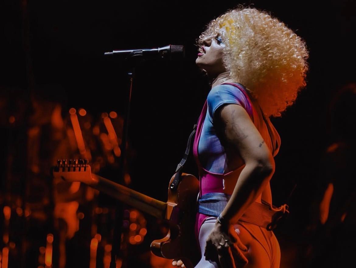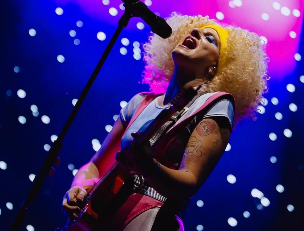 La llegada de Marilina Bertoldi suscita un plus de euforia en un público de por sí fervoroso. Con extravagante look de Barbie Fitness con pesas incluidas, lució una abultada peluca de rulos, maximizada cabellera de Marisa Paredes en ‘Tacones Lejanos. Una estética que juega con el sarcasmo y lo hiperbólico, con un brío Almodóvar llevado a un extremo hardcore. Las visuales se enmarcaban dentro de un halo conceptual que plasmaban el glamour corrompido por la desfachatez. Los tres músicos fueron tomando posiciones durante el prefacio habitual de “No quieren más mi rocanrol”. El resplandor que emulaba salir de una puerta entreabierta en pantalla, la mostraban llegar a contraluz desde el extremo derecho del escenario, con cartera en mano y movimientos quebradizos. “Para quien trabajas” y “Autoestima” fueron las primeras con las que se escuchó a Marilina rugir. “Es poderoso” dio paso a las más gritadas por sus fans: “La cena” y “Pucho”. La cantante se permitió explorar otros movimientos en “Fumar de día” y “La casa de A” y relució aún más su voz con “Enterrarte”.